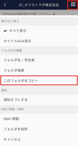①ノート一覧画面の右上「設定」>「このフォルダをコピー」をクリックします。