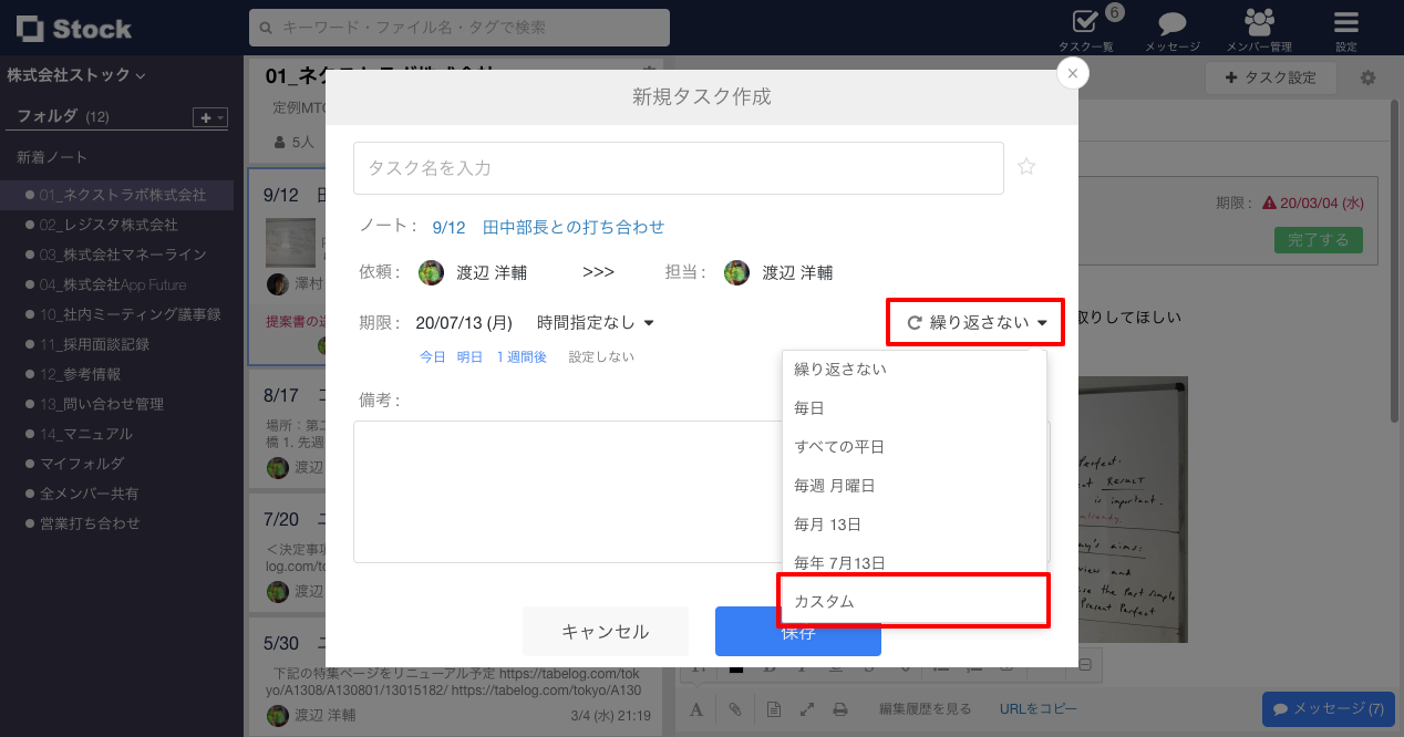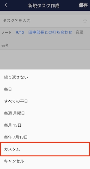 ①「タスク作成画面」の繰り返し設定にて、「カスタム」をクリックします。