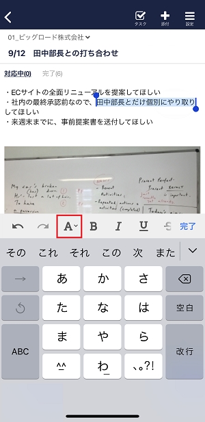 ①文字に背景色をつけたい範囲を選択し、ノート下部の「A」のアイコンをタップします。