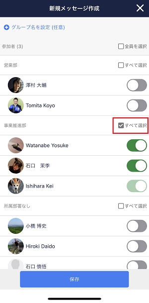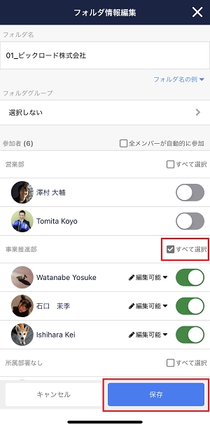 ②「所属部署名」の横に表示されている「すべて選択」をタップすると、部署単位でフォルダに参加できます。