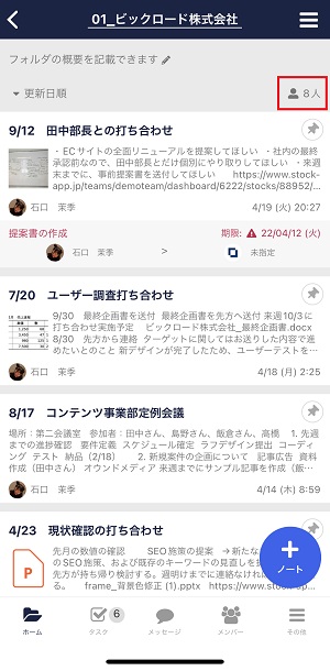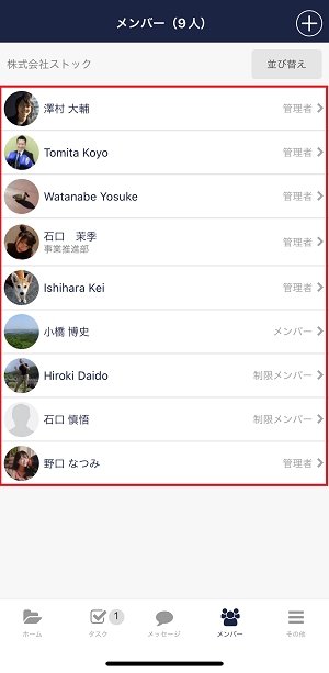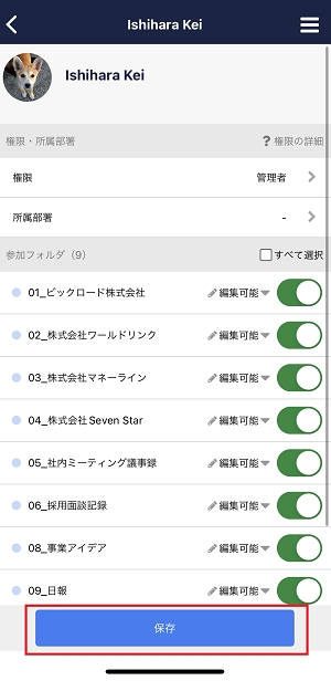 ②フォルダ参加設定を変更したいメンバーをタップします。