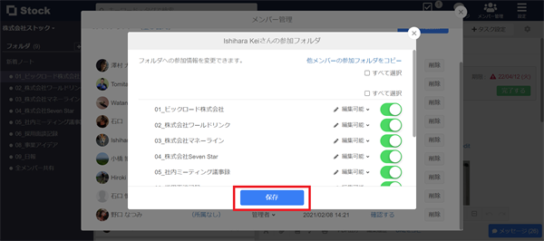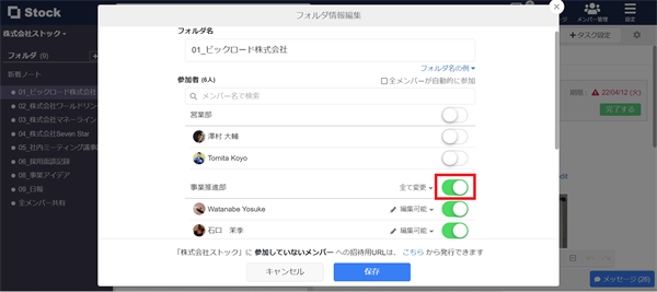 ②フォルダ参加設定を変更したいメンバーの「参加フォルダ」欄をクリックします。