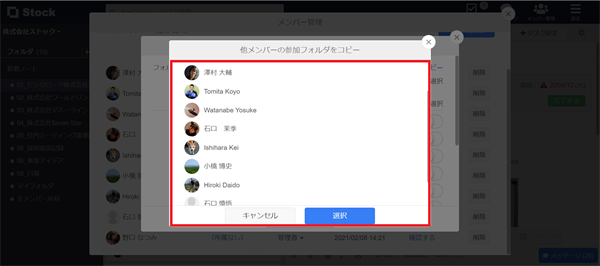④フォルダ参加設定のコピーを行いたいメンバーをクリックし、「選択」をクリックします。