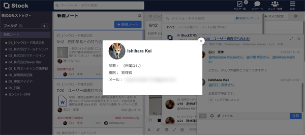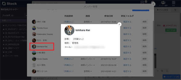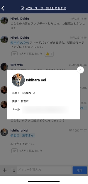 名前またはアイコンをクリックすると、「顔写真」「所属部署」「メールアドレス」を確認できます。
